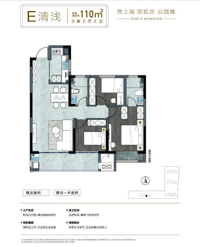 :如105平方米、110平方米的3室2厅2卫户型,空间宽敞,功能分区明确,适合三代同堂或多口之家居住。