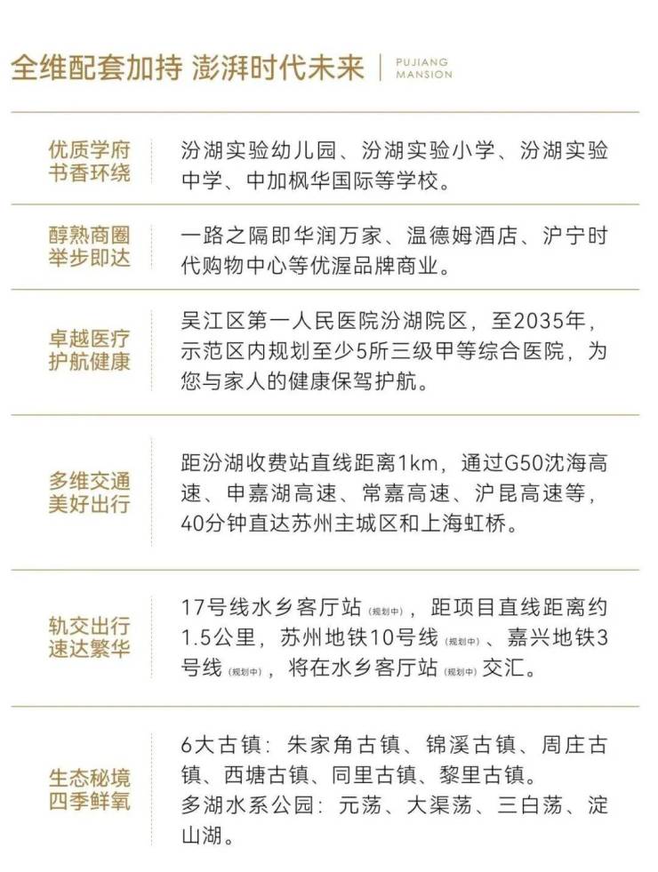 长三角一体化核心先行启动区:2023年正式批复《长三角生态绿色一体化发展示范区国土空间总体规划(2021—2035年)》,汾湖正式上升为国家规划。雄踞一体化示范区先行启动区核芯:华为研发基地、中车交通汾湖星舰超级工厂、京东智能产业园等产业环伺。上海西浦江之源,离世界更近一步,四维交通枢纽 坐标长三角之芯:沪苏湖高铁(计划2024年通车)、通苏嘉周高铁(计划2024年苏州段通车)、沪苏嘉城际铁路(计划2028年通车)、轨交17号线(规划中)轨交出行 速达繁华:17号线水乡客厅站(规划中),距项目直线距离约1.5公里,苏州地铁10号线(规划中)、嘉兴地铁3号线(规划中),将在水乡客厅站(规划中)交汇。高架林立 链接全城:距分湖收费站直线距离1km,通过G50沈海高速、申嘉湖高速、常嘉高速、沪昆高速等,40分钟直达苏州主城区和上海虹桥。浦江之源 湖海正芯:西接烟波浩渺的东太湖,东连碧波粼粼的黄浦江,际遇世界长三角的湖海正芯,孕育海纳百川的上海精神。