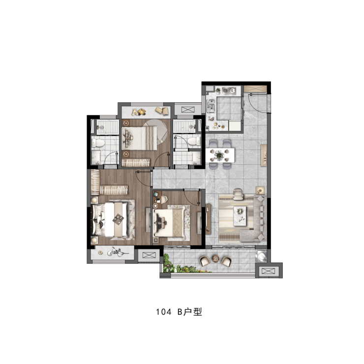 104㎡ 三室两厅两卫:总价约125万元,主打改善型三居