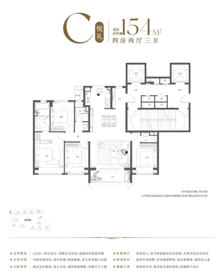 154㎡四房四室三卫,双主卧设计,电梯厅独立,L型厨房+岛台,极致改善之选