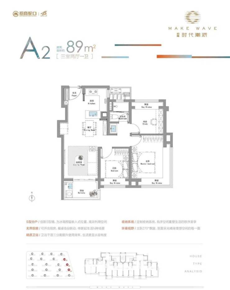建面约89㎡3房户型:东边套主卧配置约270°双向采光飘窗、S墙设计,主力总价仅约450万级,首付约90万起!