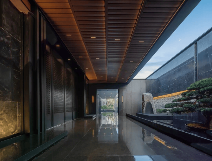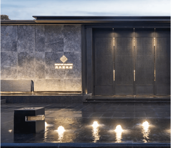 外立面融合宋式美学,铝板+石材+金色框线,打造新中式建筑标杆。