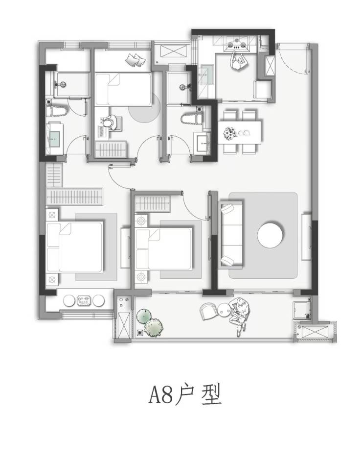 精装标准 :全屋标配 地暖+新风系统 ,厨卫采用 科勒、摩恩、老板 等一线品牌,抽拉式水槽+智能马桶成标配。
