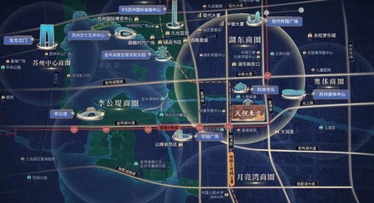 项目地处金鸡湖大道与星塘街交汇处,距5号线斜塘站约200米,步行5min即达。未来可换乘8号线(在建),快速通达奥体中心、苏州中心等核心商圈。自驾可通过金鸡湖隧道直达湖西,中新大道、星湖街等主干道形成便捷路网。