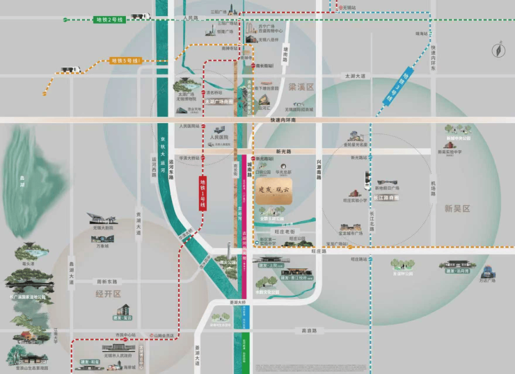 轨道交通方面,步行约200米即可到达在建的地铁5号线新光路站,未来可无缝对接无锡轨道交通网络;距离地铁1号线华清大桥站约1.2公里,2站直达太湖广场;距离地铁3号线旺庄路站约1.9公里,1站直达长江路商圈。公交线路也十分丰富,周边有5路、36路、130路、139路、201路等多条公交线路经过,覆盖新吴区主要区域。此外,通过新光路、南内环快速路、城南路、运河东路、兴源路等主干道,可便捷通达无锡各区域