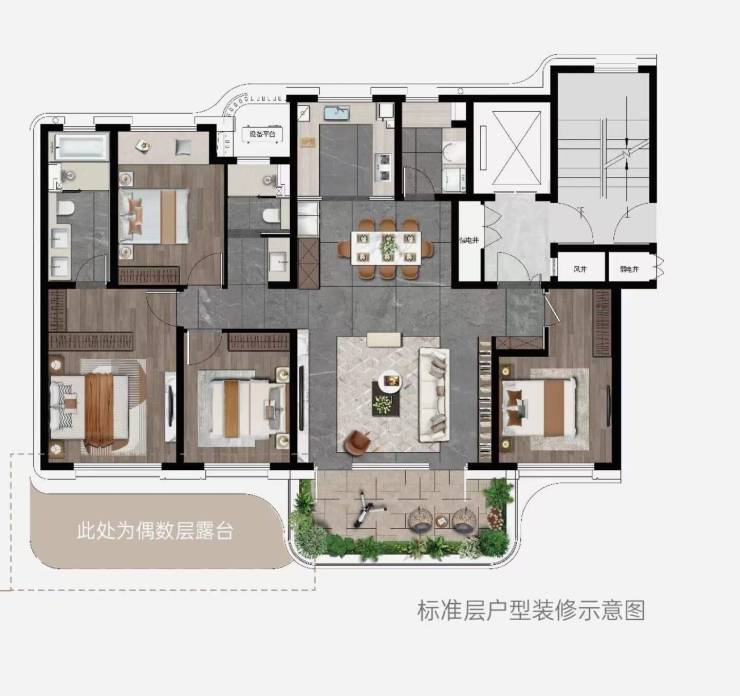所有户型均配置15-35㎡空中庭院,部分户型采用270°环幕露台,且露台超6米挑高,综合得房率能达到100%