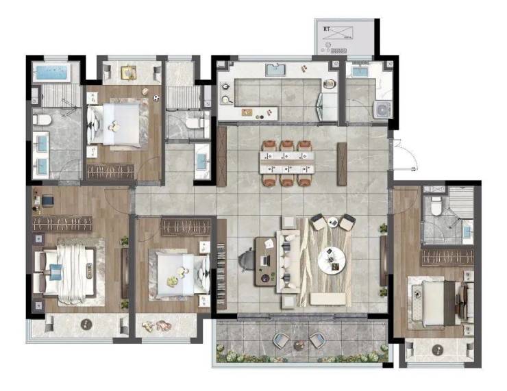 空间设计:采用“十字轴线”布局,122㎡户型储物容积达8.2m³(行业均值5.6m³)