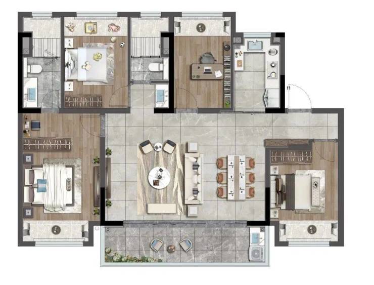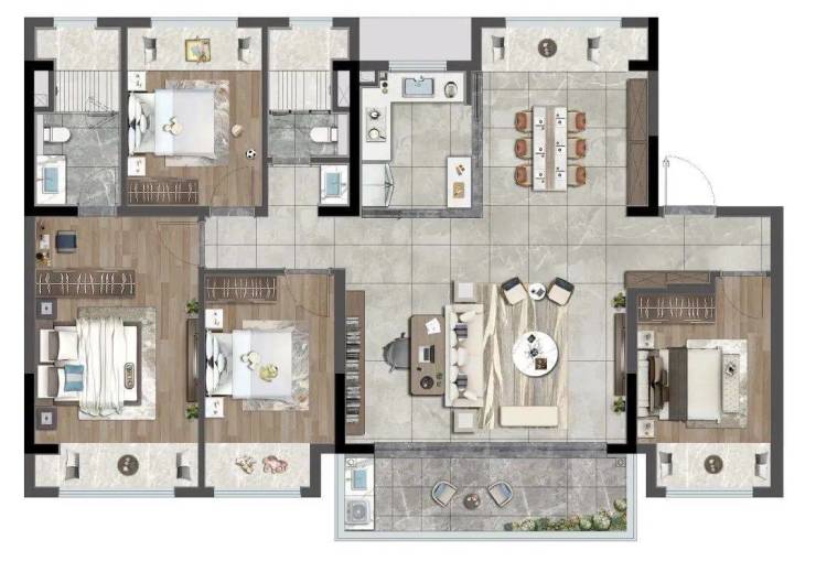 四居:129㎡(紧凑型)、134㎡(洋房专属,得房率72%)、143㎡(双套房)、173㎡(环幕视野)