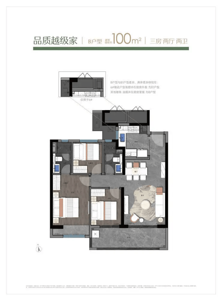 在售户型:主力户型为建筑面积约89平方米(三室两厅一卫)、100平方米(三室两厅两卫)和115平方米(三室或四室两厅两卫)的精装户型,得房率最高可达76%。