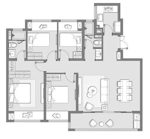 该户型为项目最大户型,超大横厅设计,餐客一体,空间感极佳;主卧带飘窗和独立卫生间,客卫完全干湿分离,生活舒适度较高。