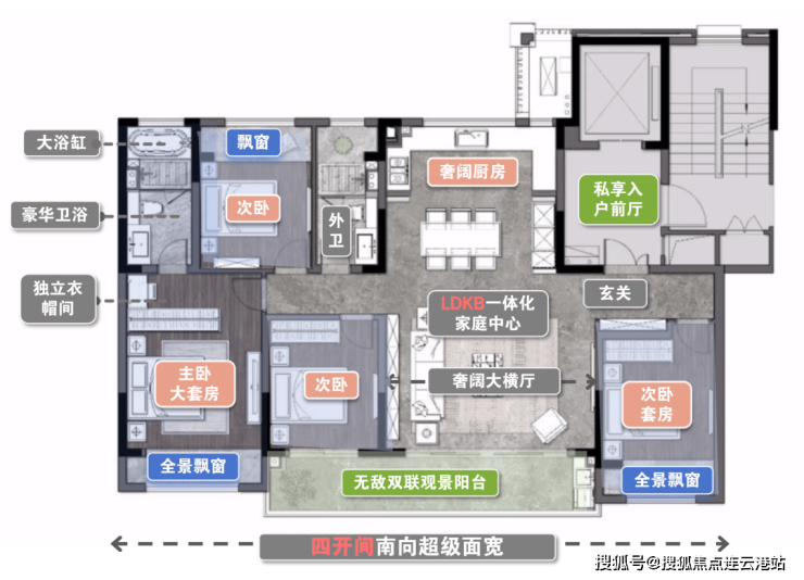 【户型亮点】全明设计,南北通透。5.7米的超大宽厅设计,市面上稀缺独有。4房型设计,可以满足三代人居住,高得房率+高赠送面积。