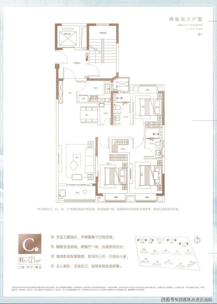 主推 118 - 122㎡全能三居室,涵盖 119㎡(1#、4# 等楼栋)、118㎡(15#)、122㎡(14#、17# 等楼栋)、121㎡(14#、17# 等楼栋)户型。2 梯 3 户设计,层高 2.9 米,总楼层 13 - 18 层,总价 170 - 190 万,满足家庭居住升级需求。