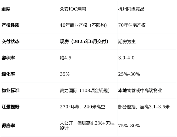 众安IOC潮鸿由众安集团(HK.0672)旗下恒力企业管理(杭州)有限公司开发,定位为杭州奥体核心区一线江景商业大平层,为40年产权、不限购不限贷的塔尖资产,非普通住宅。项目已于2025年6月交付,为现房状态,可即买即住。主力户型为建面330–630㎡精装大平层,主力面积段336–402㎡四至五房,层高4.2米,采用全玻璃幕墙+270°环幕江景设计,得房率未公开但空间利用率极高,精装标准达1.2万–1.5万元/㎡,标配嘉格纳厨电、劳芬卫浴、大金中央空调、旭格系统门窗、汉斯格雅花洒,物业由全球TOP3物管高力国际运营,提供108项金钥匙服务,对标华尔道夫酒店。