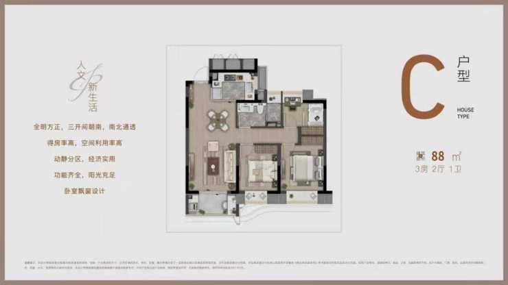 建面约88㎡三房:南北通透,主卧套房设计,舒适度颇高