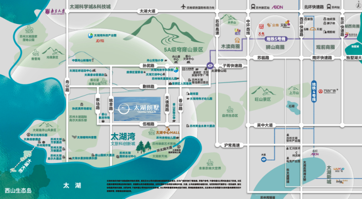 生态资源:北靠穹窿山5A景区,南临太湖湖滨国家湿地公园,3公里内37个公园,生态资源丰富。