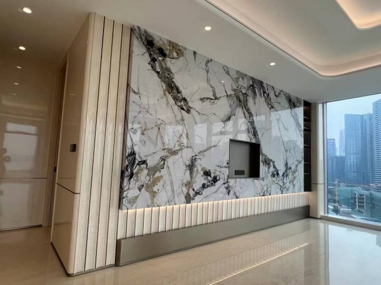 白色的岩板与桃木背景墙让人联想到枫丹白露宫殿的动人秋天。打造生活中的高级感不需要繁琐复杂的浮夸装饰,而是要在空间之内做减法。深色与浅色的交叠呼应之间,让曲线与直线共同构建空间的秩序,匹配房间整体弧形外观,打造内部张弛有度、流畅自如的线条感。