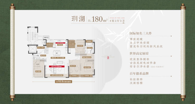 180㎡洋房:四室两厅三卫,南向面宽16.8米