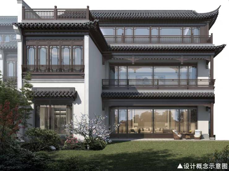 中式合院:粉墙黛瓦、飞檐翘角等传统元素与现代仿石材勒脚、铝合金门窗相结合