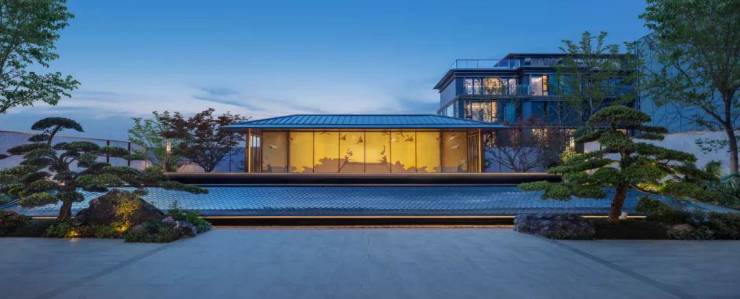 研习《营造法式》之精巧,提取宋朝代表性建筑中的中式重檐屋顶、木作构件元素,甄选铝板、石材、LOW-E玻璃、高档真石漆为主材,辅以金属格栅进行全新演绎,打造简雅秀逸的宋风公建化立面。
