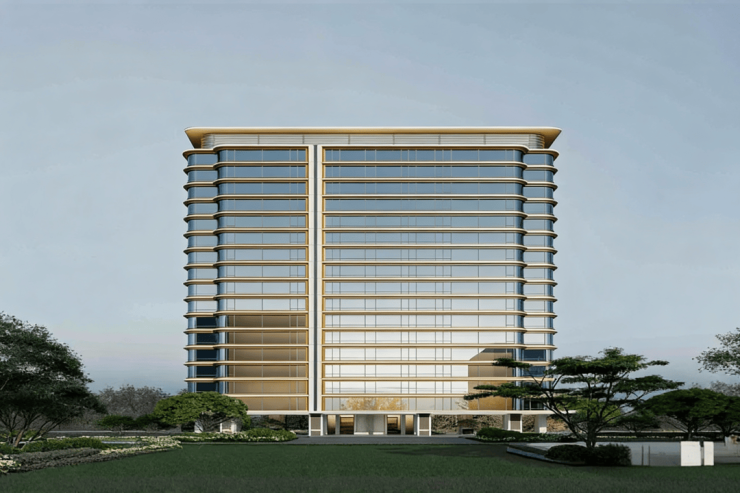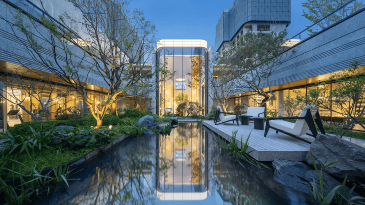 建筑风格:以“新宋风”为设计理念,打造约6000㎡实景园林,融入竹林曲径、叠石理水等宋代美学元素。建筑立面采用石材+铝板+金属格栅+大面玻璃,白、金色系搭配,弧形超大尺度玻璃窗。