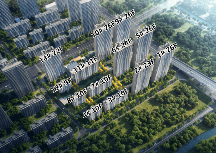 小区规划六幢洋房,七幢高层,共855套。其中,高层面积105平、115平,洋房面积143平、169平、顶复190平。