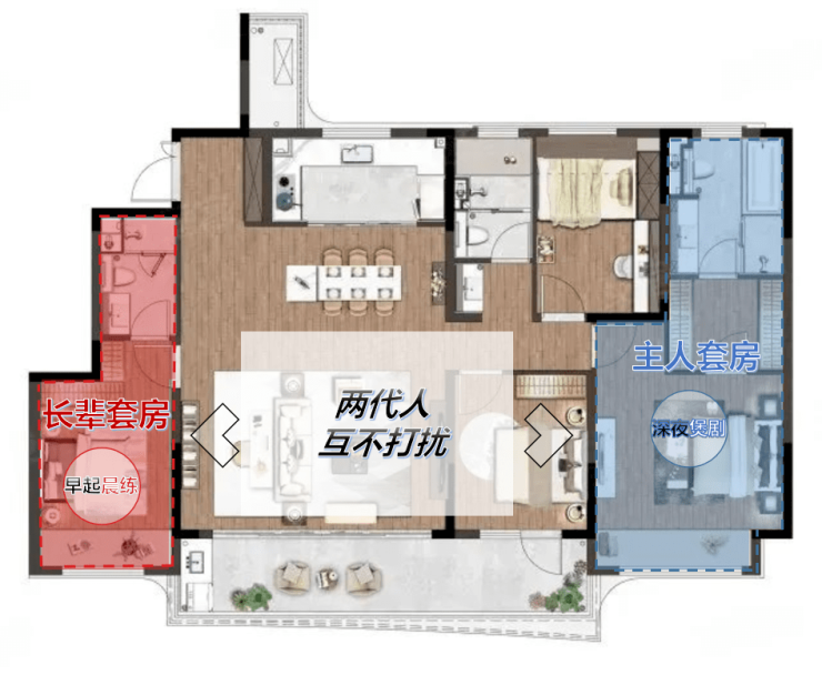 尤其是实现“空间平权”的双套房设计,充分尊重了每个人的生活习惯。