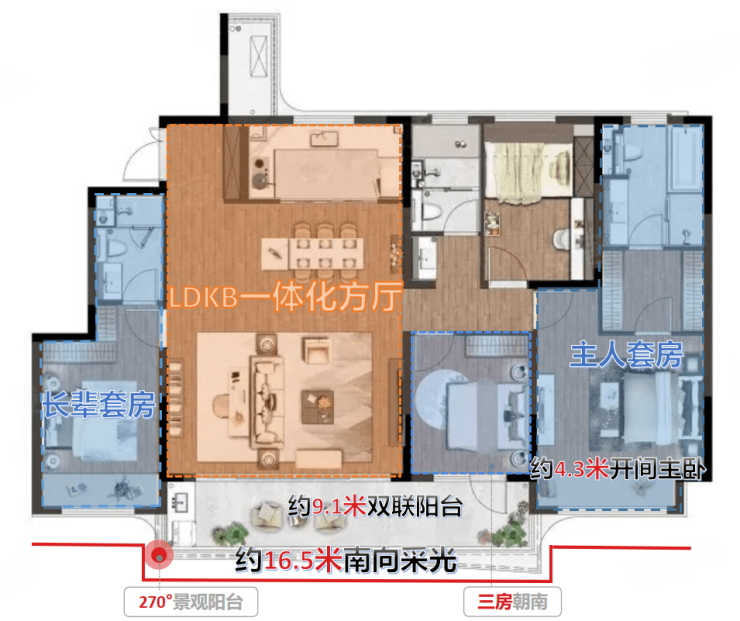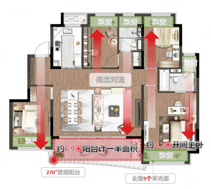 再来看,建面约169㎡的大四房,全明采光,约16.5米南向采光面,多动线南北对流,约6米开间大方厅、三房朝南,舒适性一目了然。
