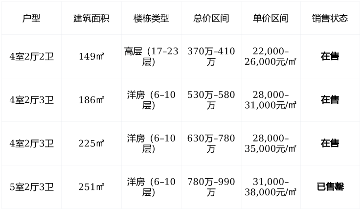 💡 价格趋势 :2025年6月均价34,000元/㎡,2026年初稳中有降, 149㎡高层性价比突出 ,186㎡洋房为当前主力成交户型。
