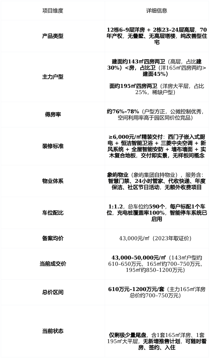 项目为 现房交付 , 精装标准已落地 , 物业由象屿物业服务有限公司 提供, 物业费4元/㎡·月 ,服务含智慧门禁、24小时巡检、代收快递、社区节日活动, 无隐形收费 。