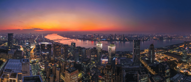 傍晚:在空中花园看钱塘江日落,江面倒映“日月同辉”