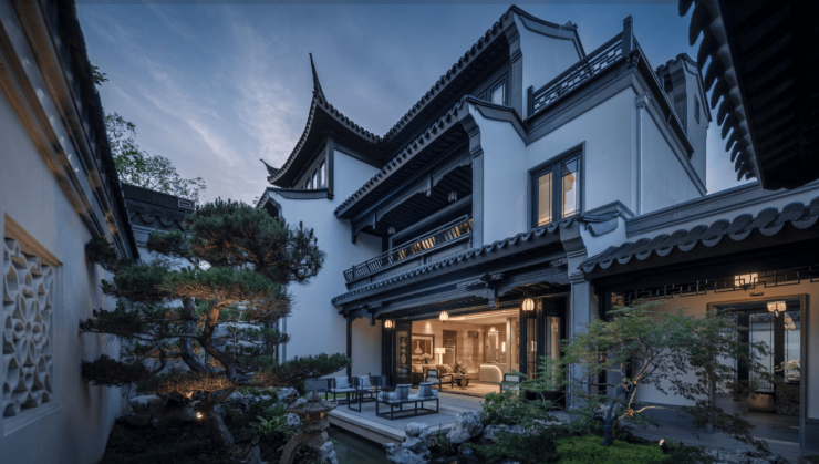 非遗工法:严格遵循香山帮传统技艺,木构件采用进口金丝柚木,漆艺使用古老的"一麻五灰"工艺,历经十余道工序手工打磨;屋面采用甘蔗脊,庭院铺装采用古法花街,细节考究。