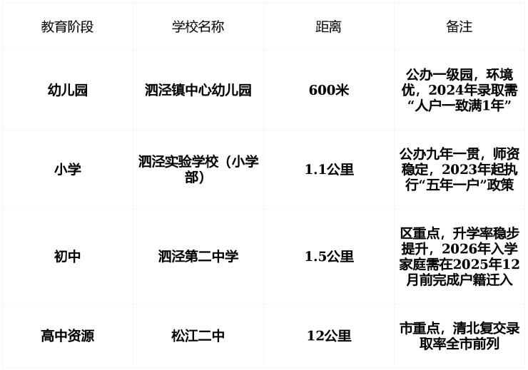 ✅ 关键提示 : 入学按“户籍+实际居住”统筹 , 泗泾实验学校已执行“五年一户”政策 , 同一房产5年内仅限一名适龄儿童入学 , 请务必确认房产未被占用 。
