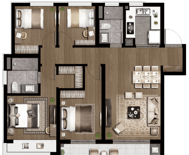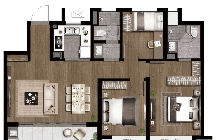 项目主打户型,南向3.5面宽,在105㎡面积段做南向餐客横厅并连通景观阳台,是该户型加分项。公卫三段式卫浴设计,干湿分离;双卧朝南带飘窗,主卧套房;