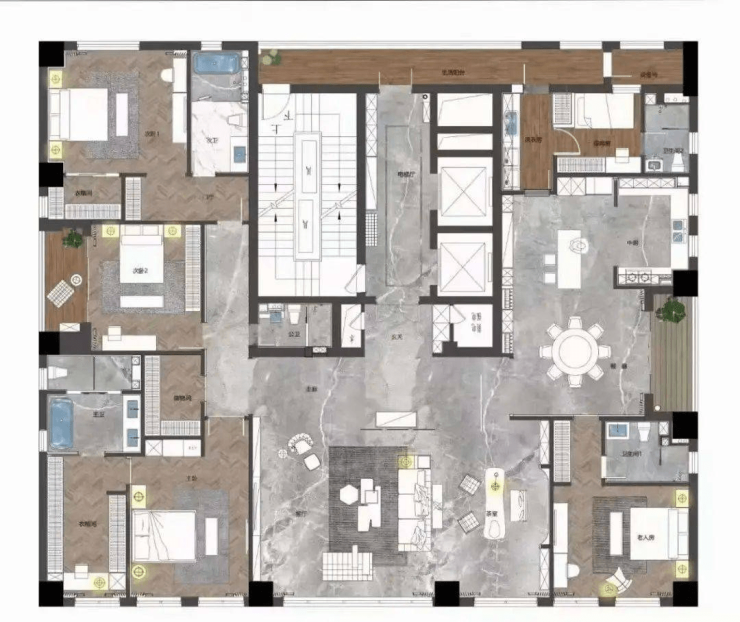 空间布局:无柱式结构,可自由规划功能分区,主卧套房面积超100㎡