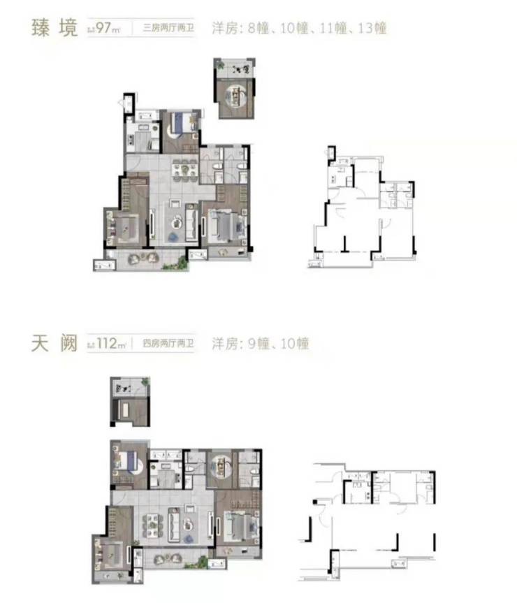 “高得房率体系”:洋房主力户型81-97㎡三居,得房率79%-84%,南北双阳台设计;高层112㎡四居采用7.2米横厅布局,满足多代同堂需求。