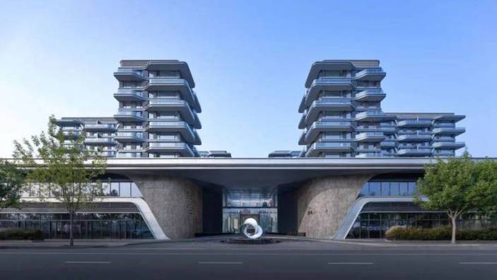 采用“新苏式公建化立面”,铝板线条与石材基座结合,270°弧线转角窗设计