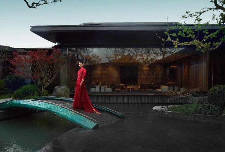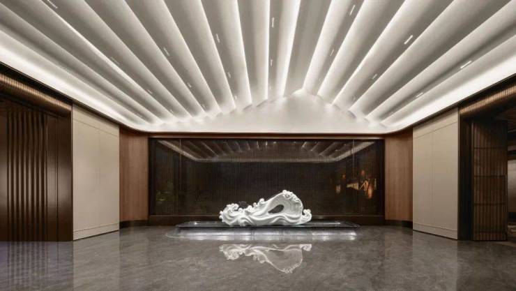 迎宾水景点缀寓意归家的屋檐雕塑,共用数百片定制金属瓦逐层叠放,形成艺术雕塑般的对景。将归家仪式与东方美学巧妙融合,让我们从喧嚣之中切换到回家的心境。