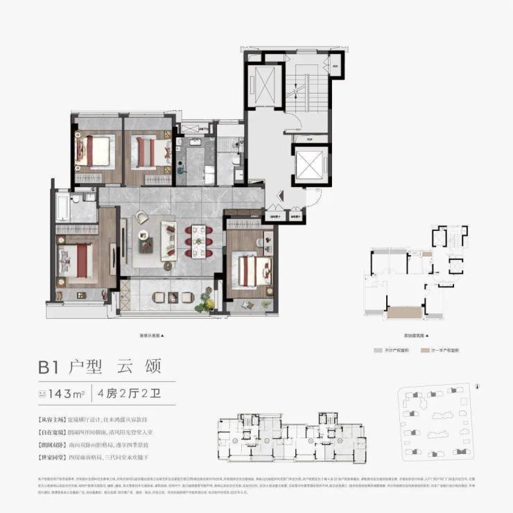 以建筑面积约143㎡四房为例,约15㎡星级套房主卧,皮质背景墙,具有强贴附性、拉伸性和可塑性,更加细腻柔软亲肤,可柔化空间氛围、吸音降噪、恒温保暖,并且安全舒适、易于保养。