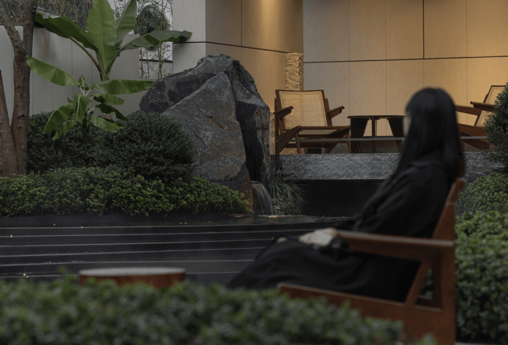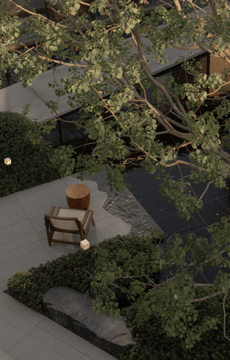 四方亭以消隐的姿态融于树影水畔之间。静坐于此,看水涧绕亭,听石瀑轻鸣,观午后斑驳光影。时光停歇,指尖轻触间感受木质座椅的纹理藏韵的时间温度。这一刻,时光慢得像一首轻缓的诗,平仄之间尽是院居的松弛惬意。至此闲适二字被拆解,精心雕琢于原石之间,流水之上,树影华盖之下。