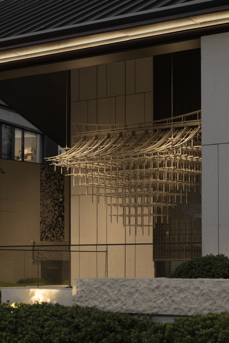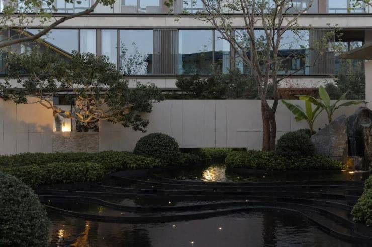 空间的韵律,在叠水与雾森间流转。一道石瀑飞流直下,落入蜿蜒如墨的水涧,层层水阶如细腻笔触,轻盈而雅致。雾霭轻起时,水汽氤氲了视线,仿若把太湖烟波缩于院中,水随雾动,雾伴水行,漫步于此,如在自然画卷中穿行,每一步都踏碎现实与古意的边界。