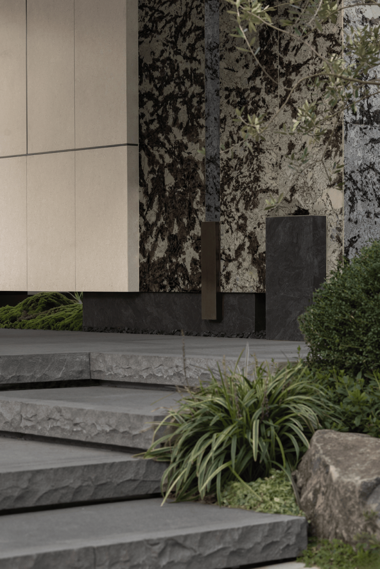 置石的苍古与花木的葱茏相映成趣,特选的造型树与景墙交融,将古典意境之美重新勾画,墙既是空间的隔离,也是自然的画布。而黑灰色山石如笔,在绿意铺陈的背景上勾勒立体的画面。每一块石的姿态、每一株树的布局,都于有限空间凝缩太湖山水灵气,让院居者在石木之间,见尽山水的咫尺乾坤。
