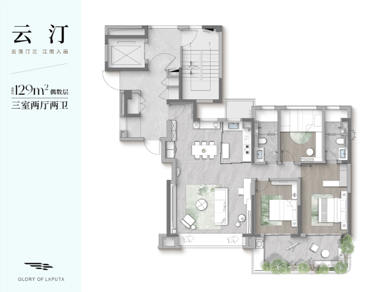 云汀129㎡:三室两厅两卫,得房率94-95%,空间利用率高