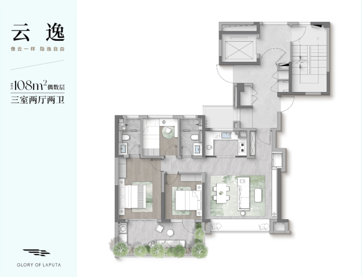 云逸108㎡:三室两厅两卫,得房率约95%,适合刚改家庭