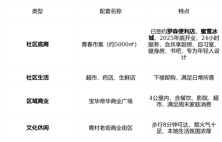 🛍️ 商业配套:社区内有“青春市集”,4公里有大型MALL