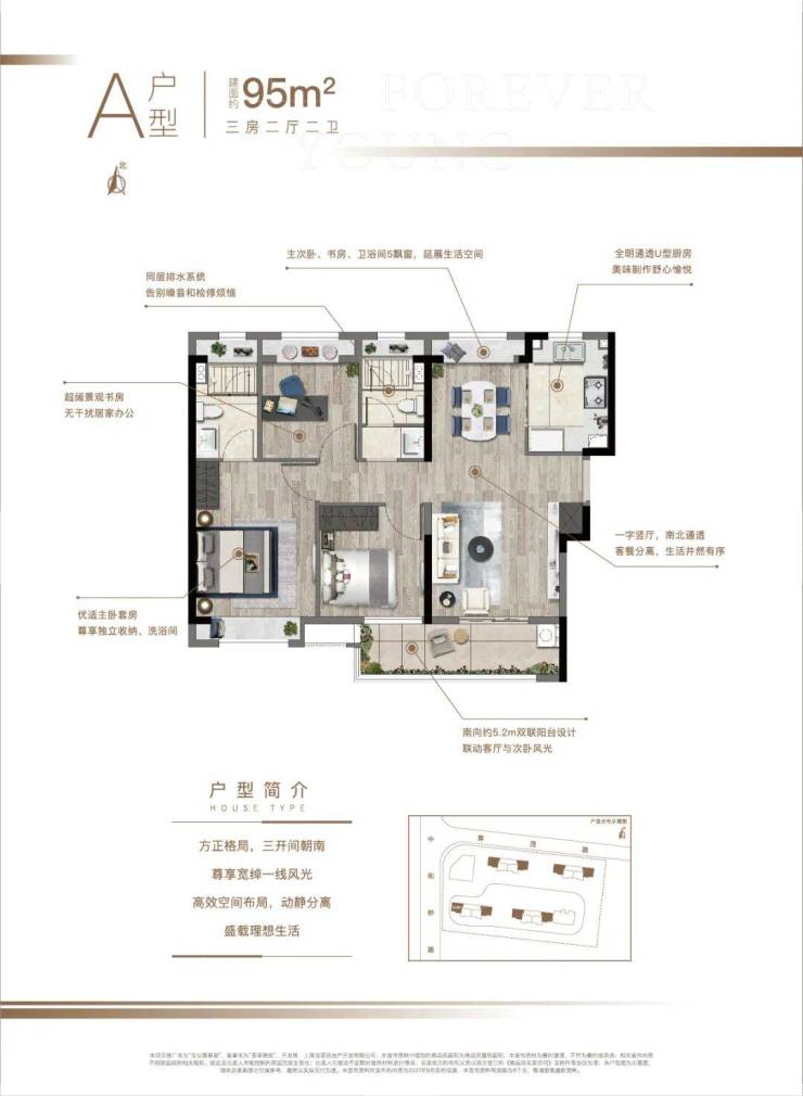 95㎡:三开间朝南+双联阳台,主卧套房设计,6.8米宽厅连接景观阳台
