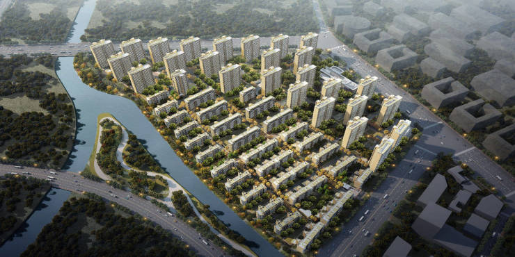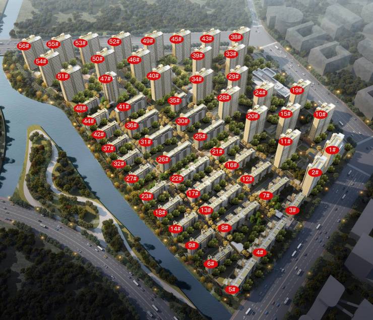 社区内部景观与外部沿河景观带相融合,打造无界亲水森居生活