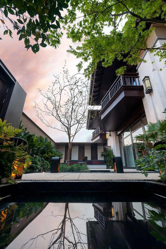 容积率0.4,规划157席精装合院及排屋,外立面采用白洞石石材+现代玻璃幕墙,融合新亚洲建筑美学与自然山体形态