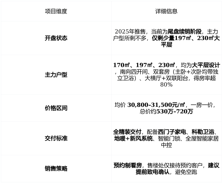 在售状态 : 持续热销中 ,主力户型为170㎡–230㎡大平层, 精装交付 ,均价约 3.1万元/㎡ ,总价区间 530万–720万 ,剩余房源有限。