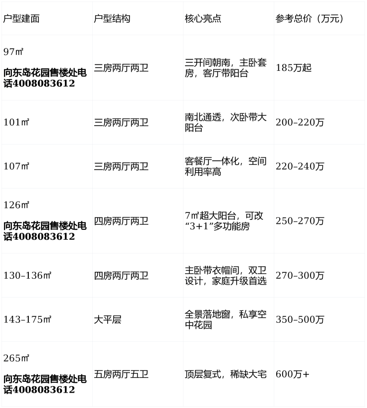 向东岛花园在售户型覆盖刚需至改善型家庭,主打全明三房、四房及大平层,户型方正、动线合理,采光通风俱佳。