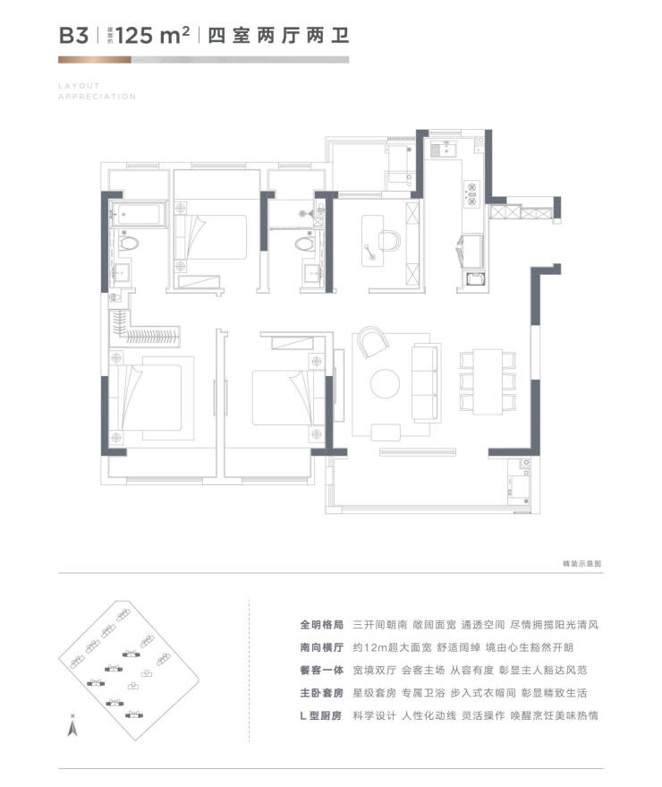 【建面125㎡4居】价格待定-分布于11幢 ,1梯2户,层高3.00米,总楼层26F